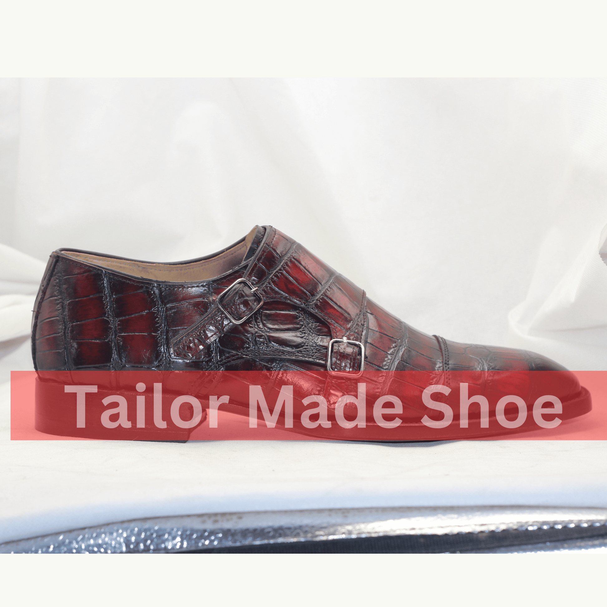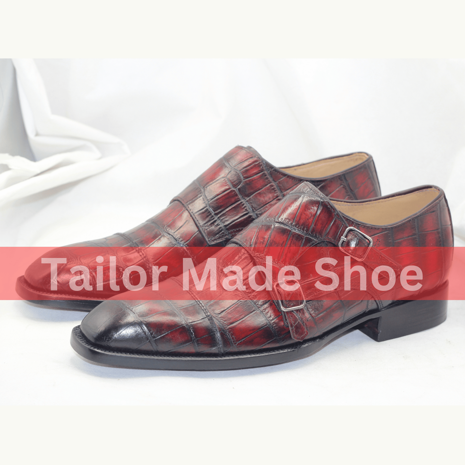 Luxury Handmade Leather Monk Straps – Burgundy Alligator-Style Design for Formal Occasions